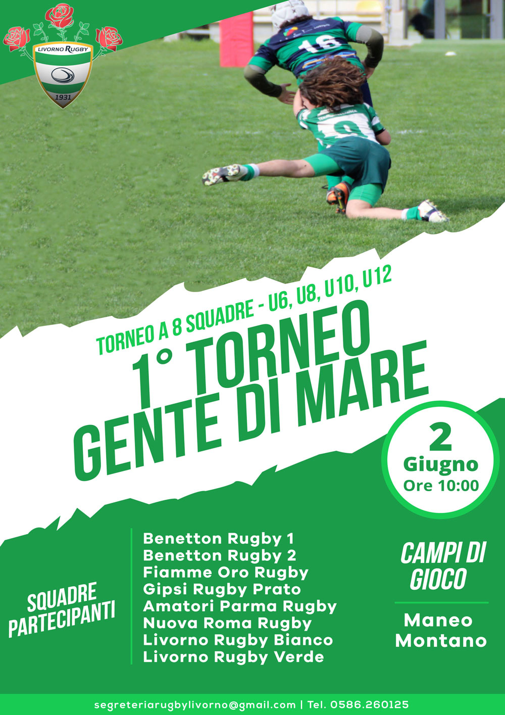 Sabato 2 giugno avrà luogo, organizzato dalla società biancoverde, il 1° Torneo “Gente di Mare”, dedicato a 8 squadre per ogni categoria under 6, under 8, under 10 e under 12. L’evento, omologato dalla FIR, è in programma sul campo ‘Montano’ di via dei Pensieri e sul terreno ‘Maneo’ di via Settembrini. Alla kermesse parteciperanno società di primissimo piano: al via, per ciascuna categoria, Benetton Treviso (con due squadre), Fiamme Oro Roma, Nuova Rugby Roma, Amatori Parma, Gispi Prato e ovviamente – con due squadre – i padroni di casa del Livorno Rugby. Nel corso della mattinata, spazio alle partite del girone eliminatorio under 6, under 8 e under 10 al ‘Montano’ e under 12 al ‘Maneo’. Nel pomeriggio, finali (tutte al ‘Montano’). Previsti gironi all’italiana a 8 squadre con finale tra il primo e il secondo posto.